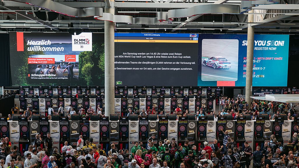 Der mythische Nürburgring in der Eifel. Draußen die kurvenreiche Rennstrecke, auf der sonst Motoren dröhnen – drinnen ein anderes Geräusch: Stimmengewirr, das Klacken von Pfeilen aus Kunststoff.